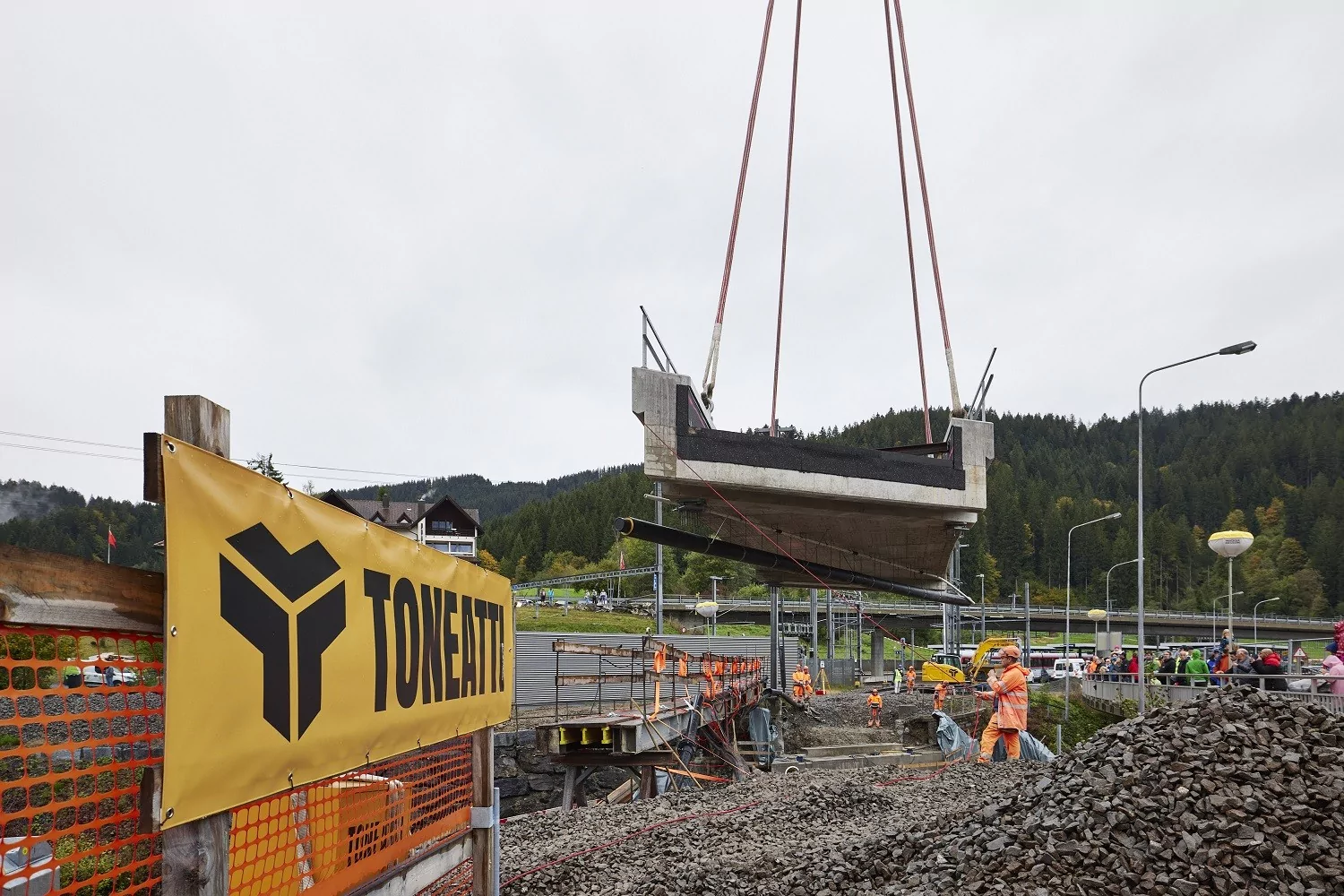 An den Wochenenden vom 10. – 12. Juni 2022 und 17. – 19. Juni 2022 verschob die Toneatti AG je eine Stahlbetonbrücke, welche 700 to, respektive 600 to wiegt präzise an den dafür vorgesehenen Zielort.