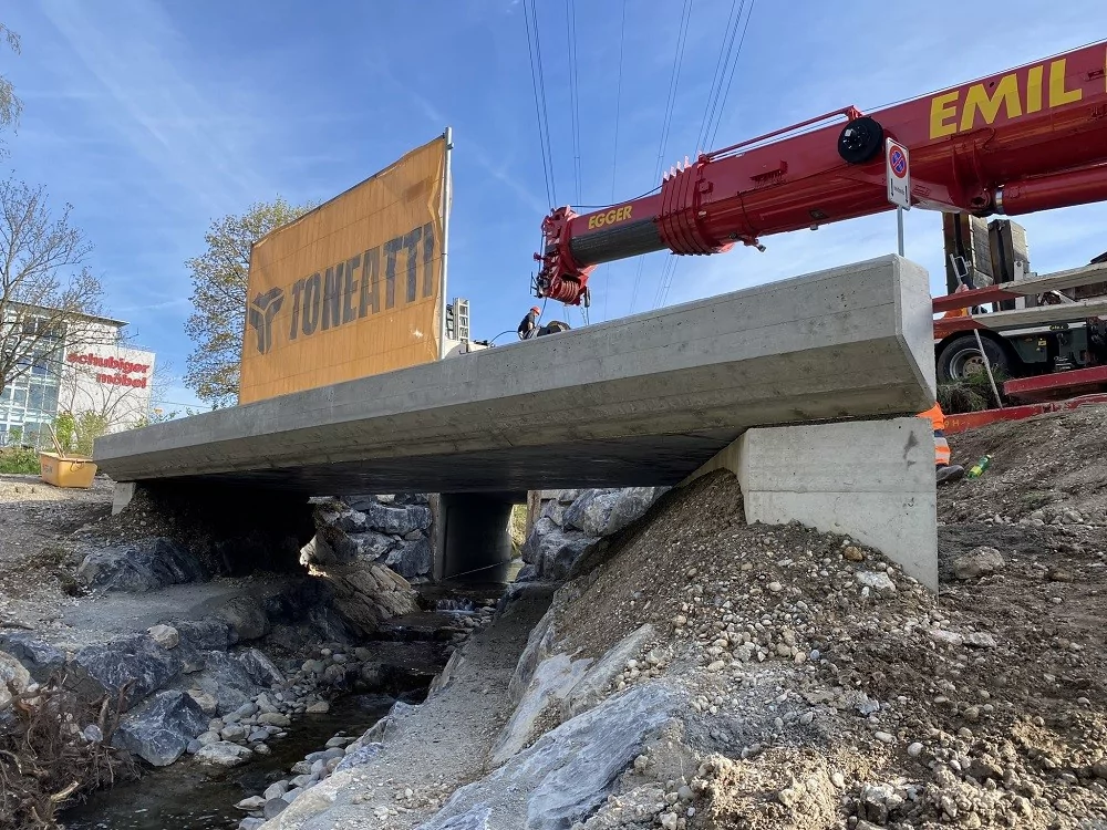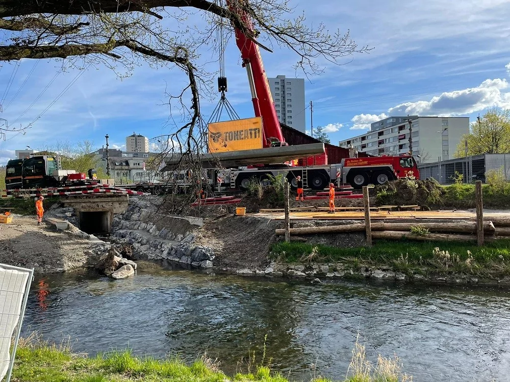 An den Wochenenden vom 10. – 12. Juni 2022 und 17. – 19. Juni 2022 verschob die Toneatti AG je eine Stahlbetonbrücke, welche 700 to, respektive 600 to wiegt präzise an den dafür vorgesehenen Zielort.