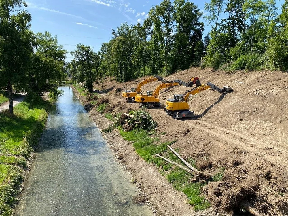 Die Arbeiten im Fluss sind derzeit in vollem Gange. Beginnend am nördlichen Ende wurden alte Betonstrukturen entfernt und durch naturnahe Ufer ersetzt. Ein neuer Erholungspfad wurde entlang des Flusses angelegt, der mit Ruhezonen und Informationspunkten ausgestattet wird. Um den Hochwasserschutz zu gewährleisten, wurden gezielte Maßnahmen durchgeführt, wie zum Beispiel die Anlage von Auen und die Erweiterung des Flussbetts.