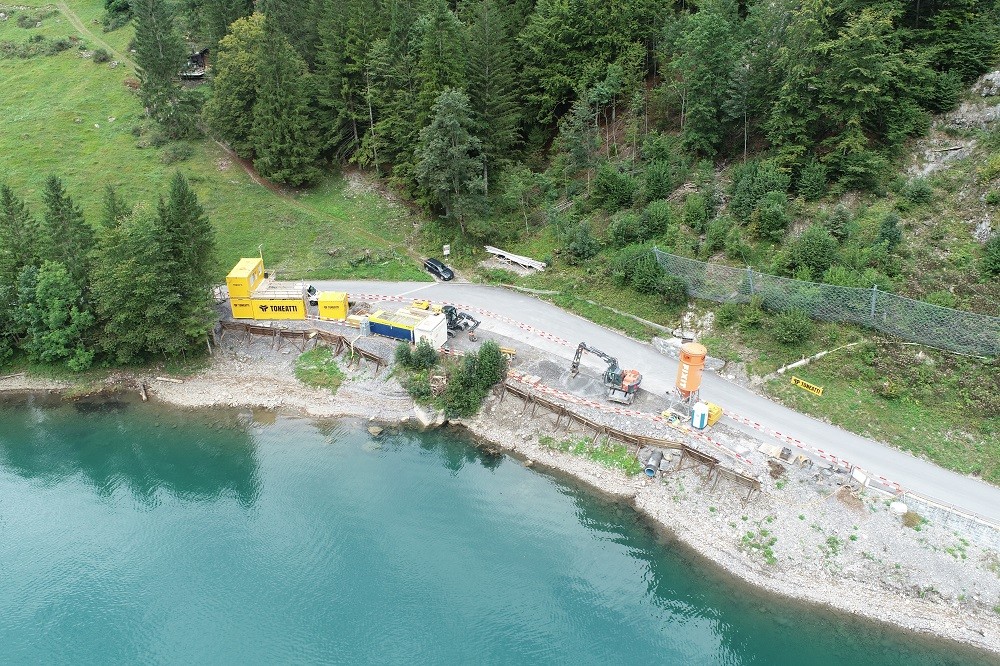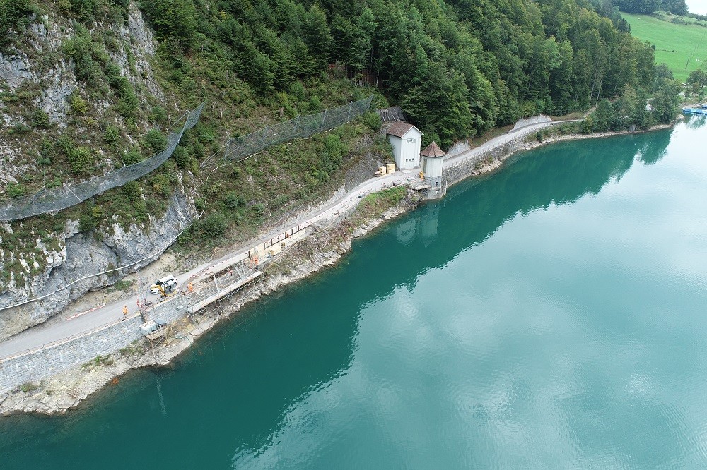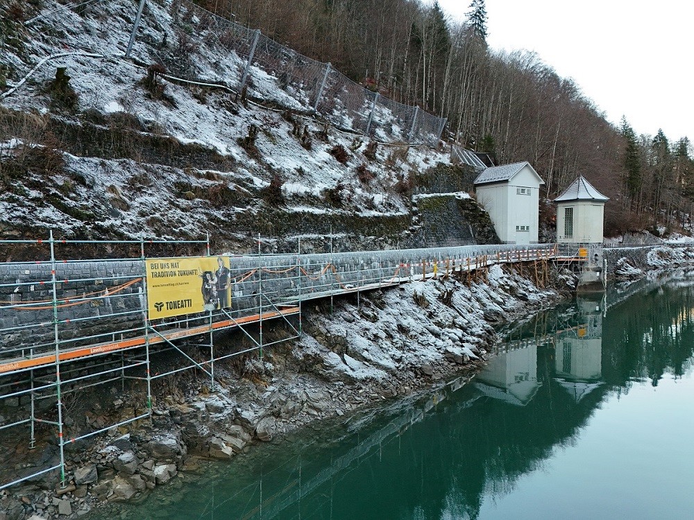 Die Toneatti AG führt die Instandsetzung der talseitigen Stützmauer sowie der Strasse durch. Die Modernisierung der Klöntalerstrasse erfolgt im Abschnitt Vorder Ruestelchopf, einer besonders engen und stark frequentierten Strecke. Diese wird auf einer Länge von rund 400 Metern saniert, wobei der motorisierte Verkehr vom Langsamverkehr entkoppelt wird. Ein neuer Fussgängersteg auf der Seeseite der Strasse wird erstellt, um den Verkehr sicher zu entflechten. Die bestehende Stützmauer wird grösstenteils belassen, jedoch stellenweise mittels rückverankerter Betonriegel gesichert. Der Mauerkopf wird auf ganzer Länge rückgebaut und durch eine neue Natursteinbrüstung mit Betonkern ersetzt, die gleichzeitig zur Stabilisierung und Krafteinleitung für den Fussgängersteg dient.