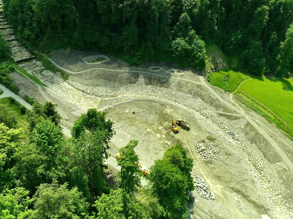 Durch den Rückhalt des Geschiebes während eines Hochwasserereignisses werden die Aufladungen im Gerinne stromabwärts stark reduziert und die Wasser- und Geschiebeaustritte verhindert. Der Ablagerungsplatz soll rund 18’000 m3 Geschiebe aufnehmen. Das alte Gerinne wird abgebrochen, abgesenkt und ausgeweitet. Dadurch werden diverse Gefahrenstellen in Bezug auf Hochwasser entschärft.