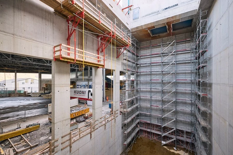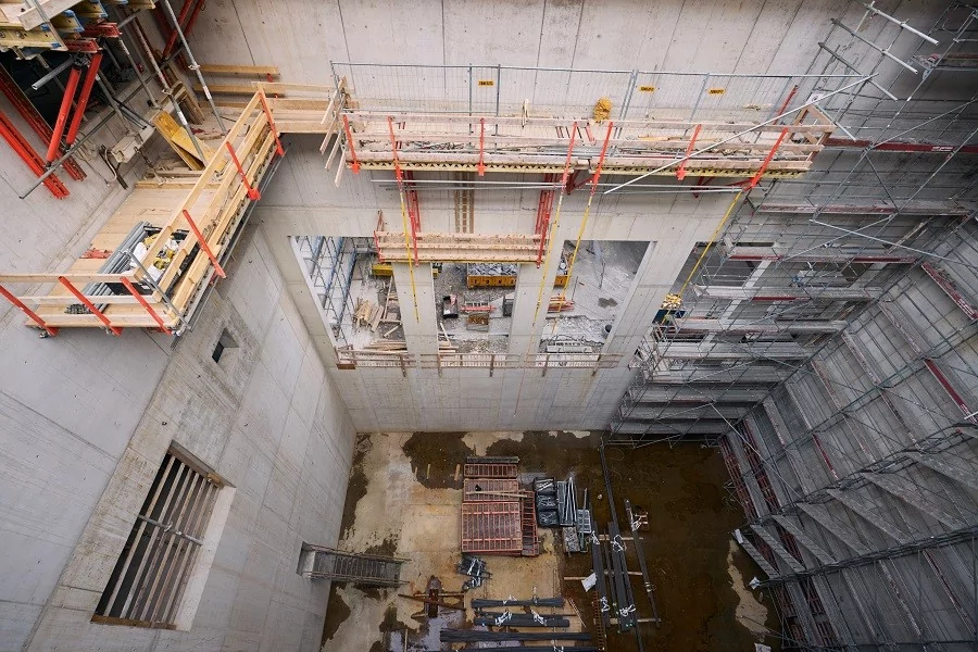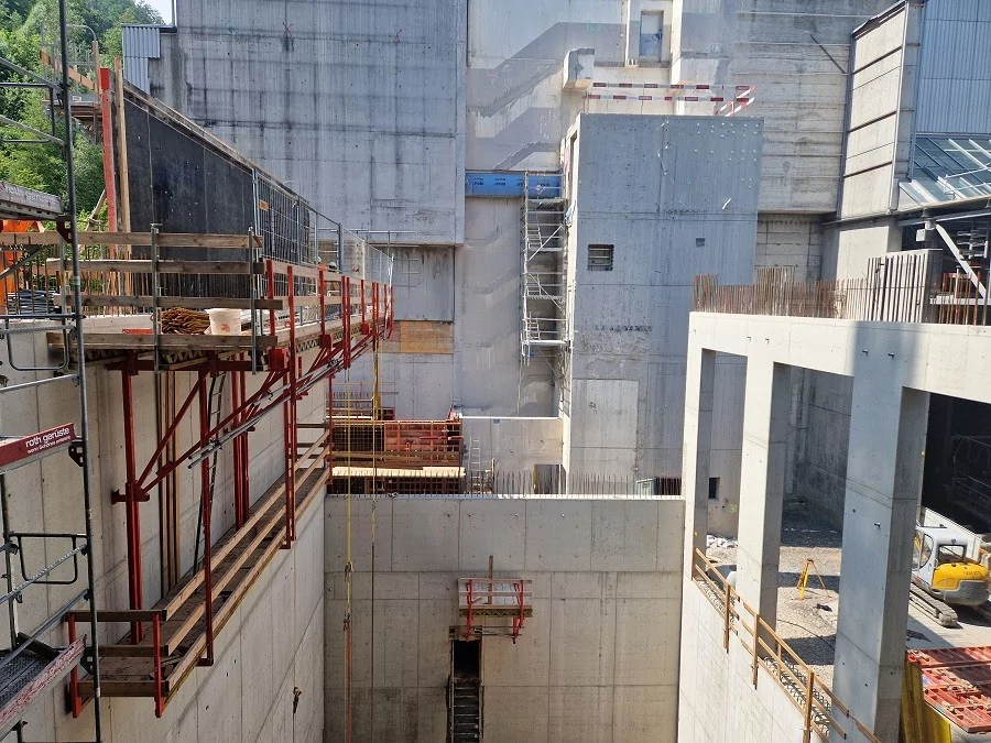 Für die Umsetzung wird Spezialtechnik eingesetzt, darunter Kletterschalungen, Hebebühnen und gespriesste Arbeitsbühnen, die schwere Maschinen tragen können. Ergänzt werden diese Massnahmen durch komplexe Spezialtiefbauarbeiten.