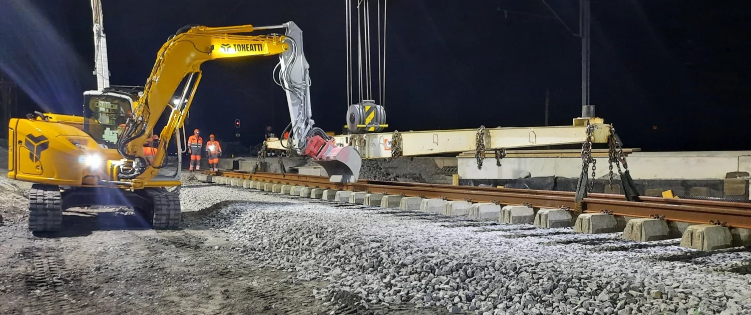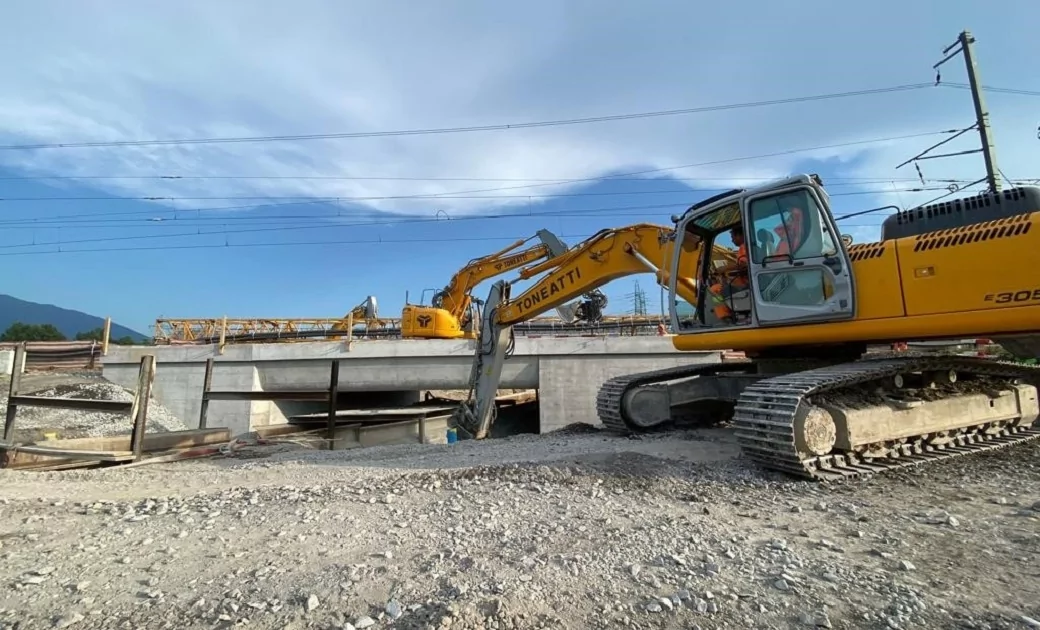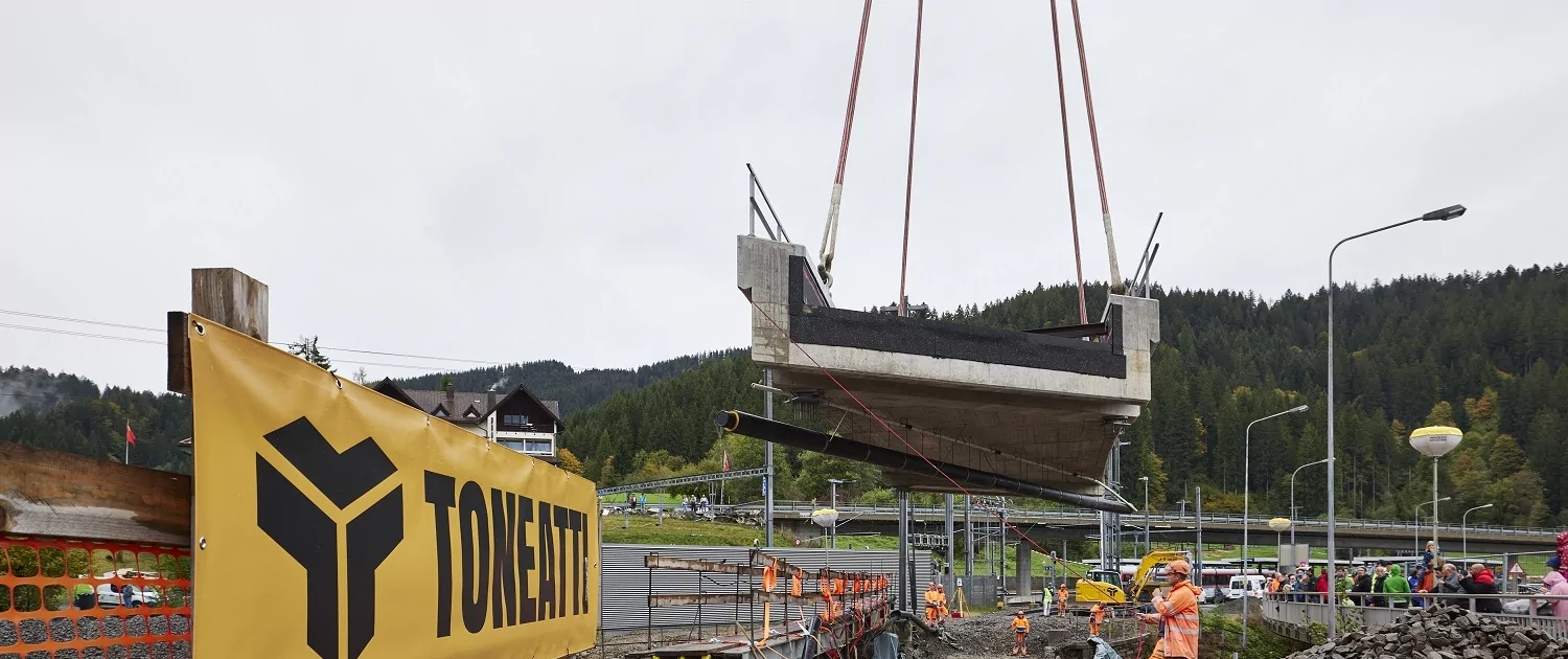 An den Wochenenden vom 10. – 12. Juni 2022 und 17. – 19. Juni 2022 verschob die Toneatti AG je eine Stahlbetonbrücke, welche 700 to, respektive 600 to wiegt präzise an den dafür vorgesehenen Zielort.