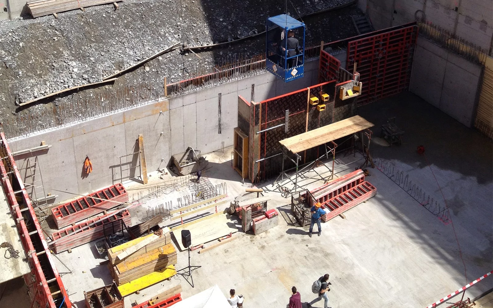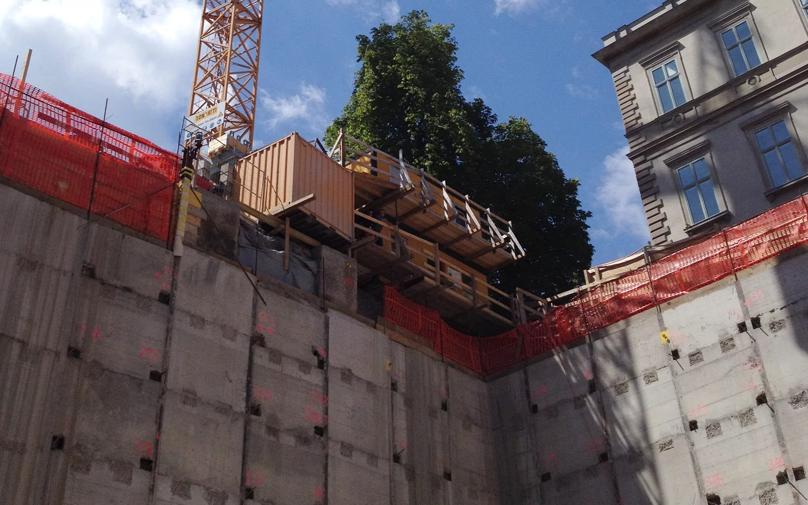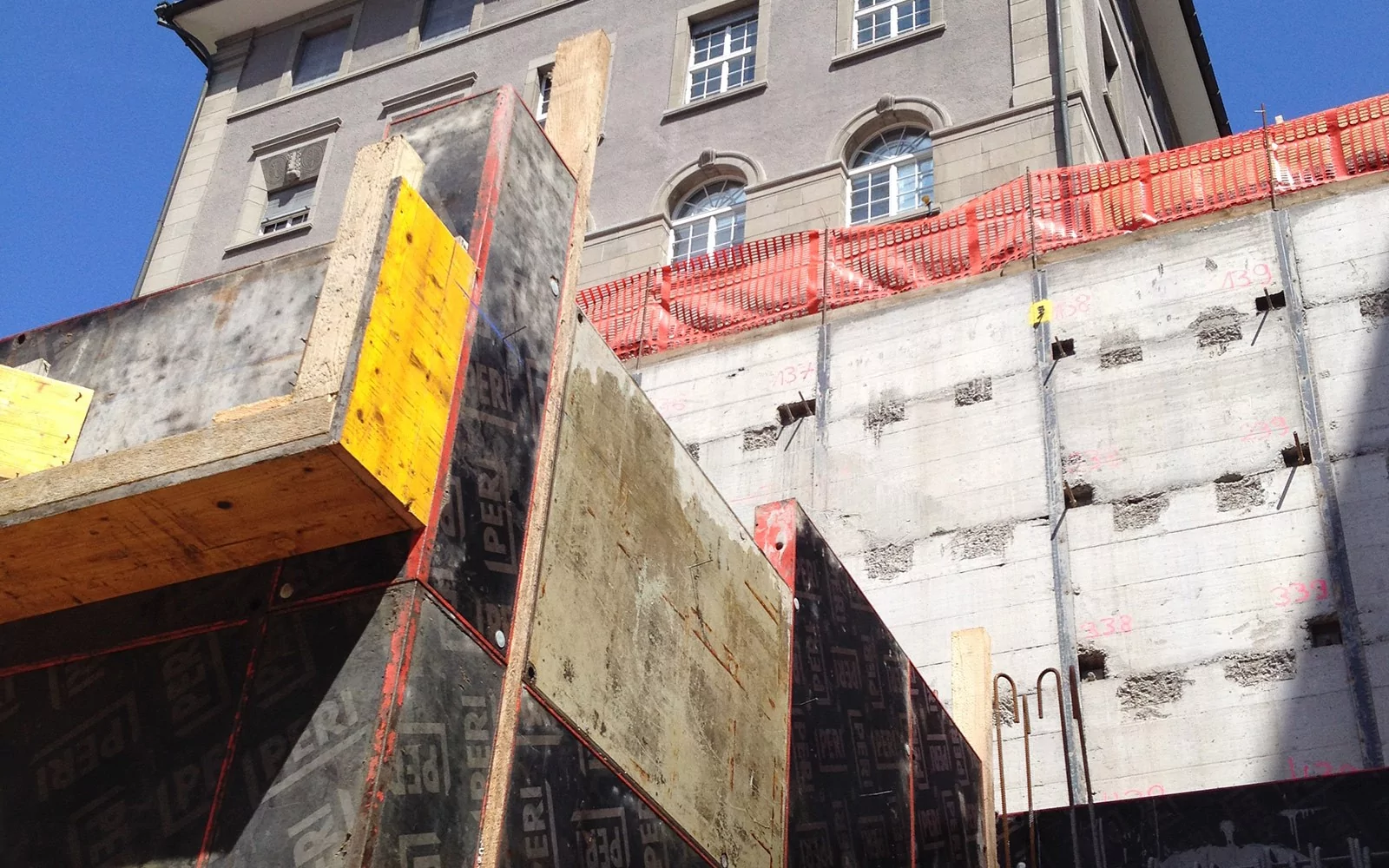 Anspruchsvolle Sichtbetonarbeiten Typ 4.4 , städtische Platzverhältnisse. Baugrube mit Rühlwandkonstruktion (Tiefe rund 15 m), Anpassungen und Umbauarbeiten der Villa Planta.