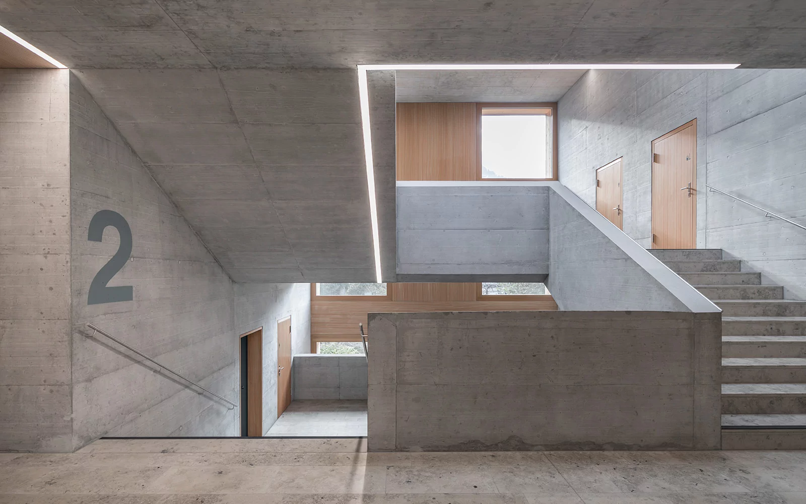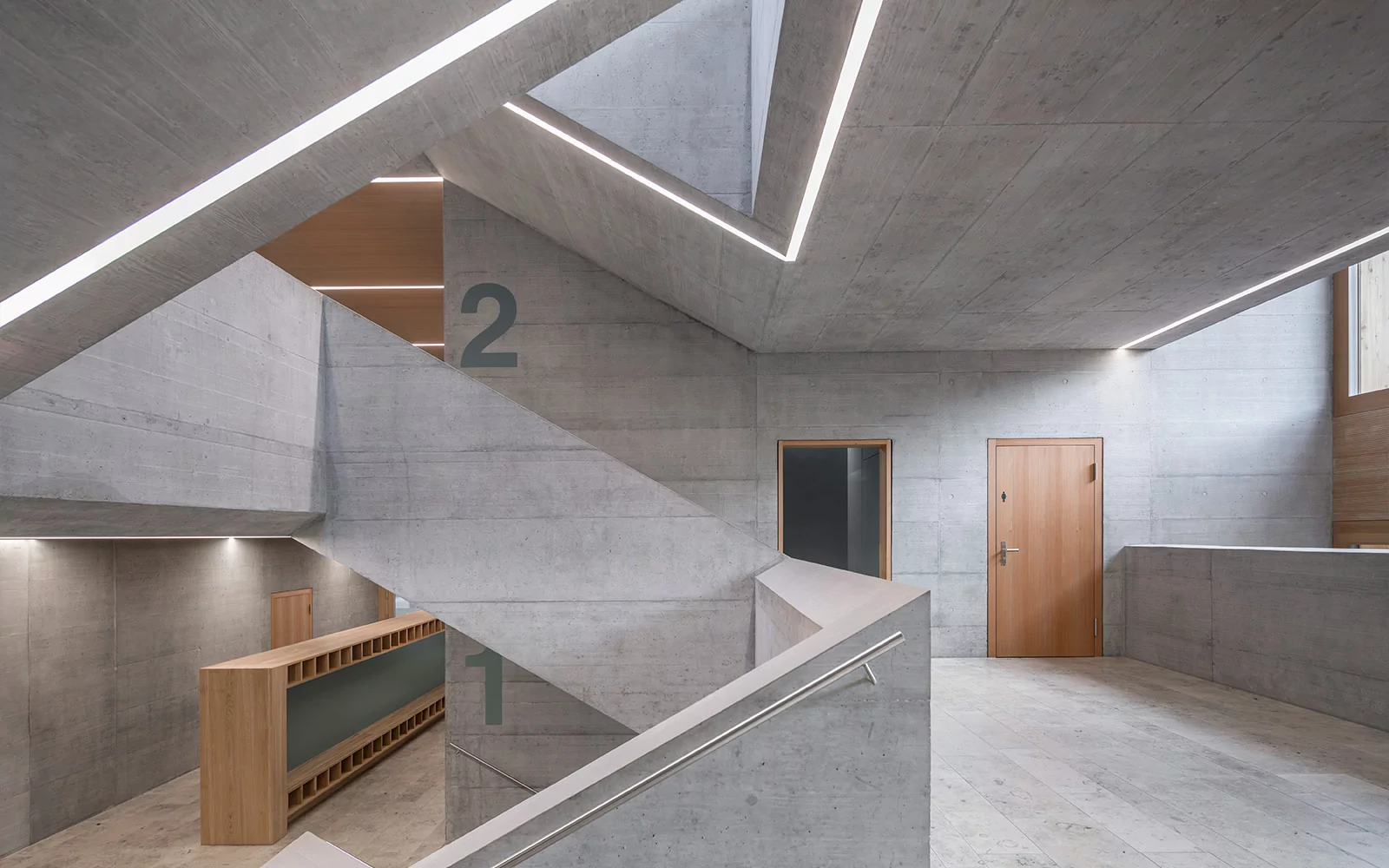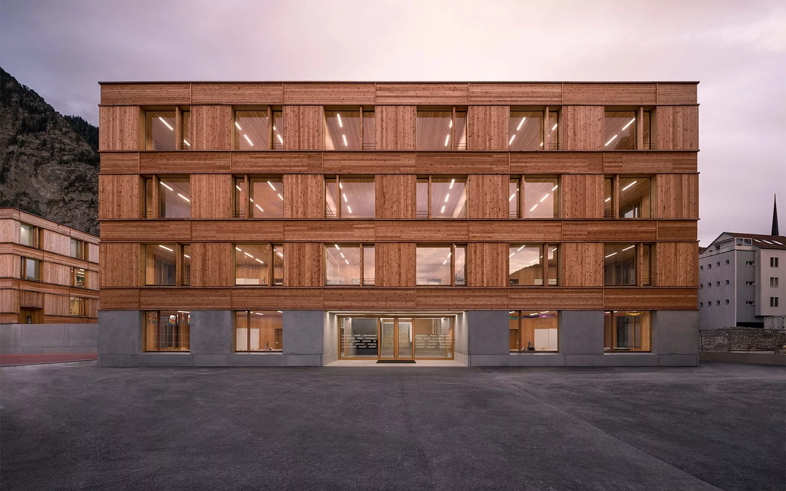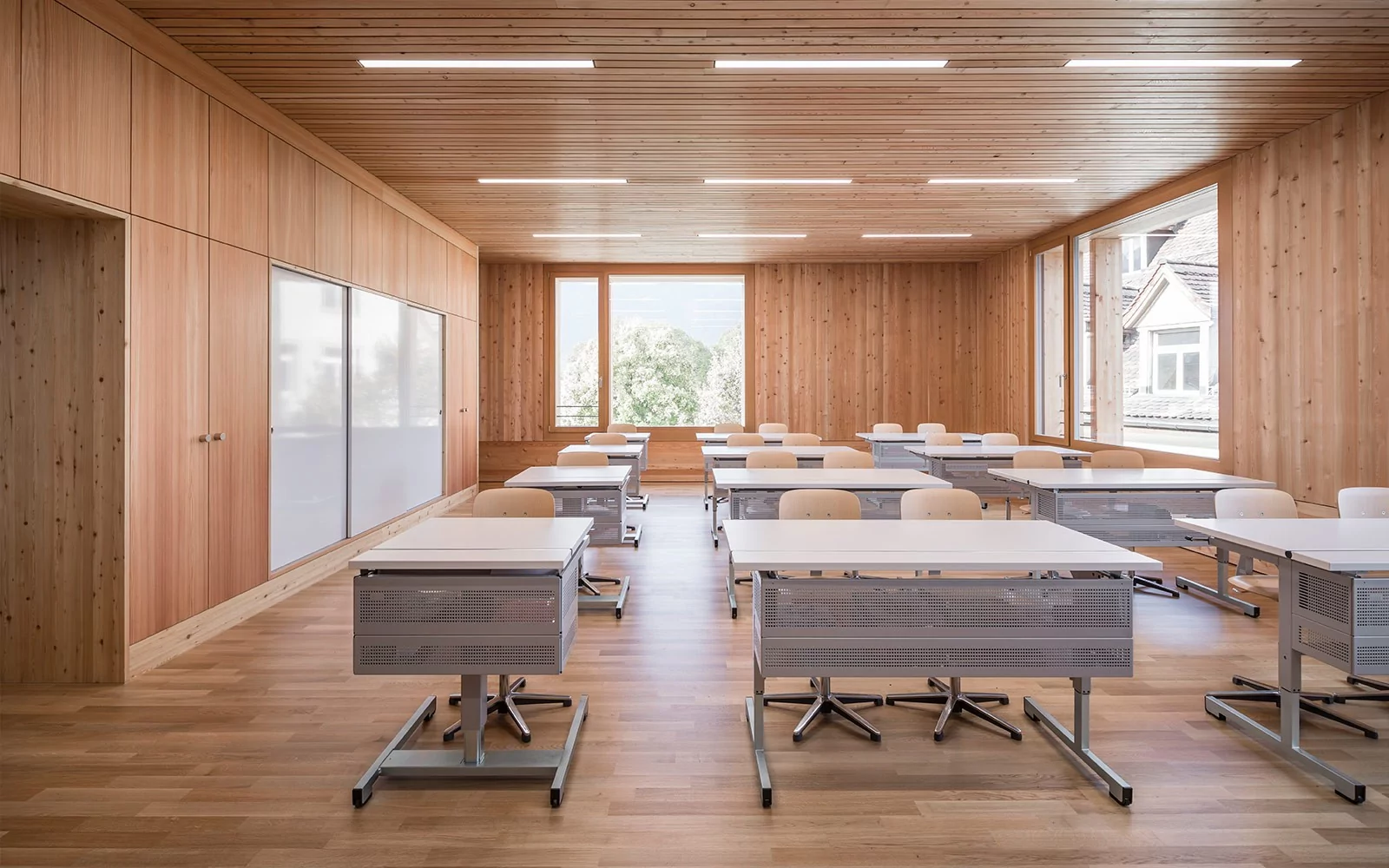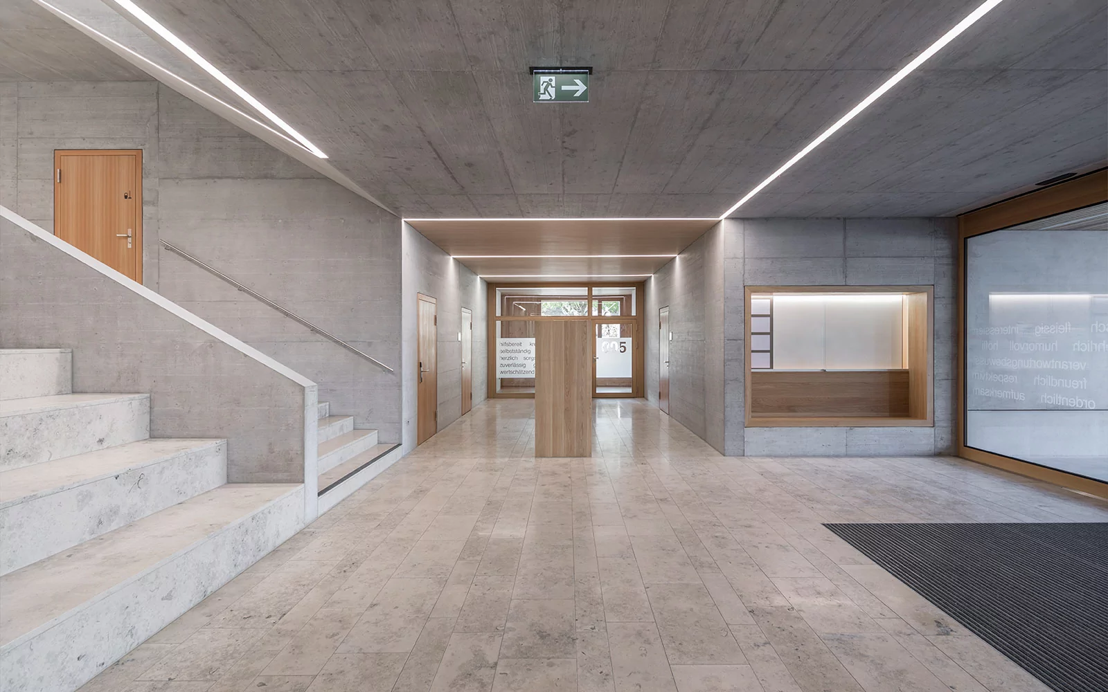 Erweiterung Schulanlage, Betonbau mit Sichtbetonarbeiten, Hybridbauweise mit tragender Holzfassade.