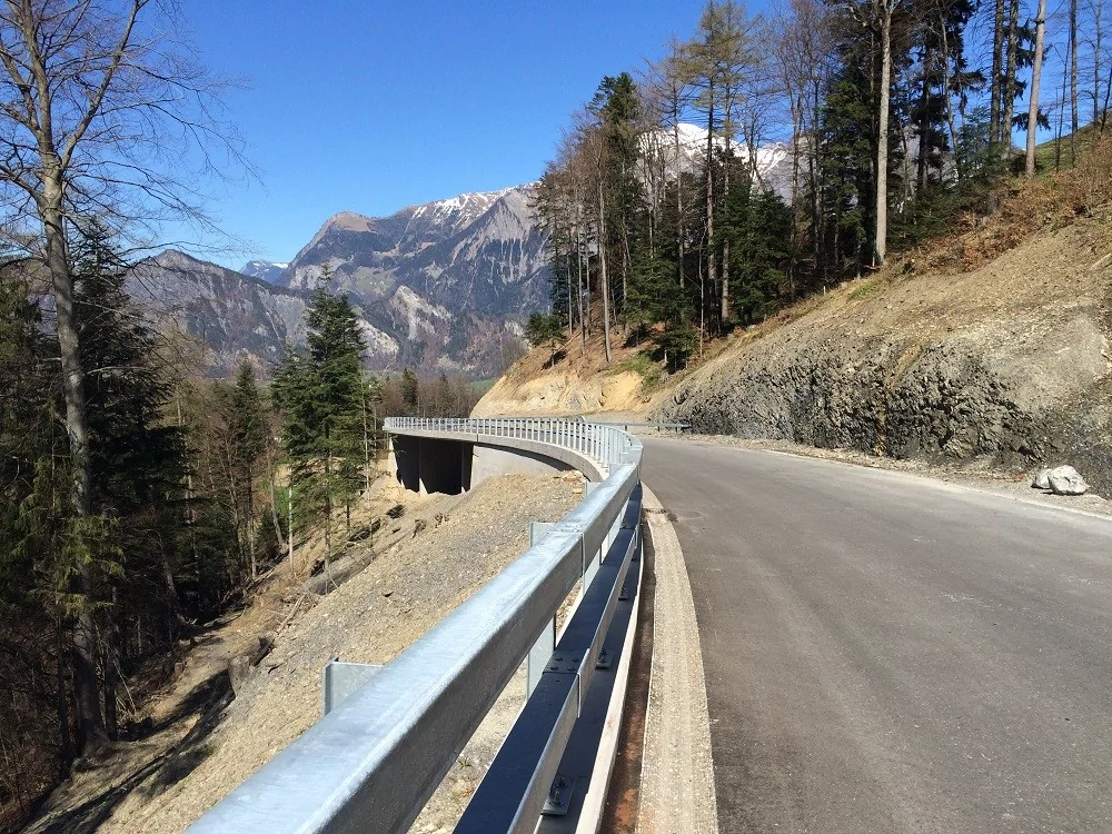 Neue Verbindungsstrasse Pfäfers-Valens inkl. Werkleitungen-, Strassenbauarbeiten, Brückenbauwerke mit Lehnenviadukten und Stützmauern, Fundationen mit Mikropfahlfundationen und Verankerungen, Erdarbeiten und Dammschüttungen.